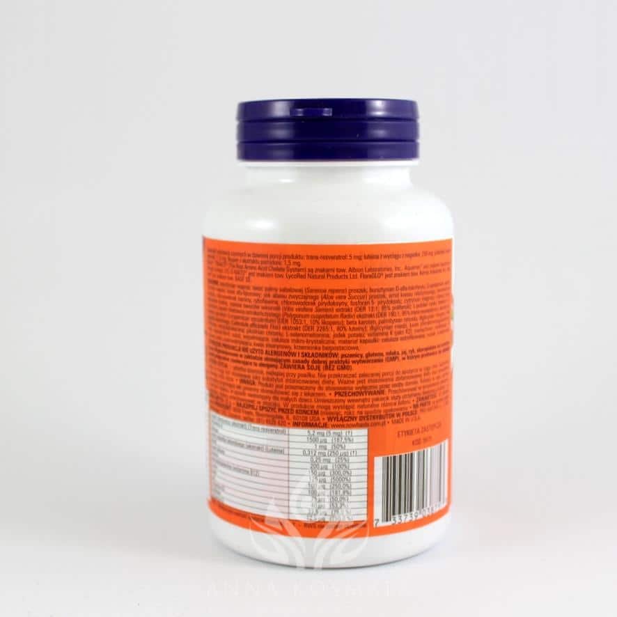 Składniki: Askorbinian wapnia; owoc palmy sabałowej (Serenoa repens) proszek; bursztynian D-alfa-tokoferylu; D-pantotenian wapnia; cytrynian wapnia; kwas alfa-liponowy; sok aloesu zwyczajnego (Aloe vera Succus) proszek; amid kwasu nikotynowego – hexanikotynian inozytolu; chlorowodorek tiaminy; ryboflawina; chlorowodorek pirydoksyny, fosforan-5- pirydoksalu; cytrynian magnezu; chlorek potasu; dwuwinian choliny; nasiona owoców winorośli (Vitis vinifera Semen) – ekstrakt (DER 12:1; 95% polifenoli); L-pidolan cynku; koenzym Q10 (ubichinon); korzeń rdestowca ostrokończystego (Polygonum cuspidatum Radix) – ekstrakt (DER 190:1, 95% trans-resveratrolu); ekstrakt koncentratu pomidora (Lycopersicon esculentum) (DER 1053:1, 10% likopenu); beta karoten, palmitynian retinolu; diglicynian manganu; kwiat nagietka lekarskiego (Calendula officinalis Flos) ekstrakt (DER 2265:1, 80% luteiny); diglicynian miedzi; kwas pteroilomonoglutaminowy; D-biotyna; metylokobalamina; pikolinian chromu; L-selenometionina; jodek potasu; witamina K (jako K2 – menachinon); molibdenian (VI) sodu; ergokalcyferol; subst. wypełniająca: celuloza mikro-krystaliczna; materiał kapsułki: celuloza estryfikowana; nośnik – kroskarmeloza sodowa; substancja przeciwzbrylająca: kwas stearynowy, krzemionka bezpostaciowa.