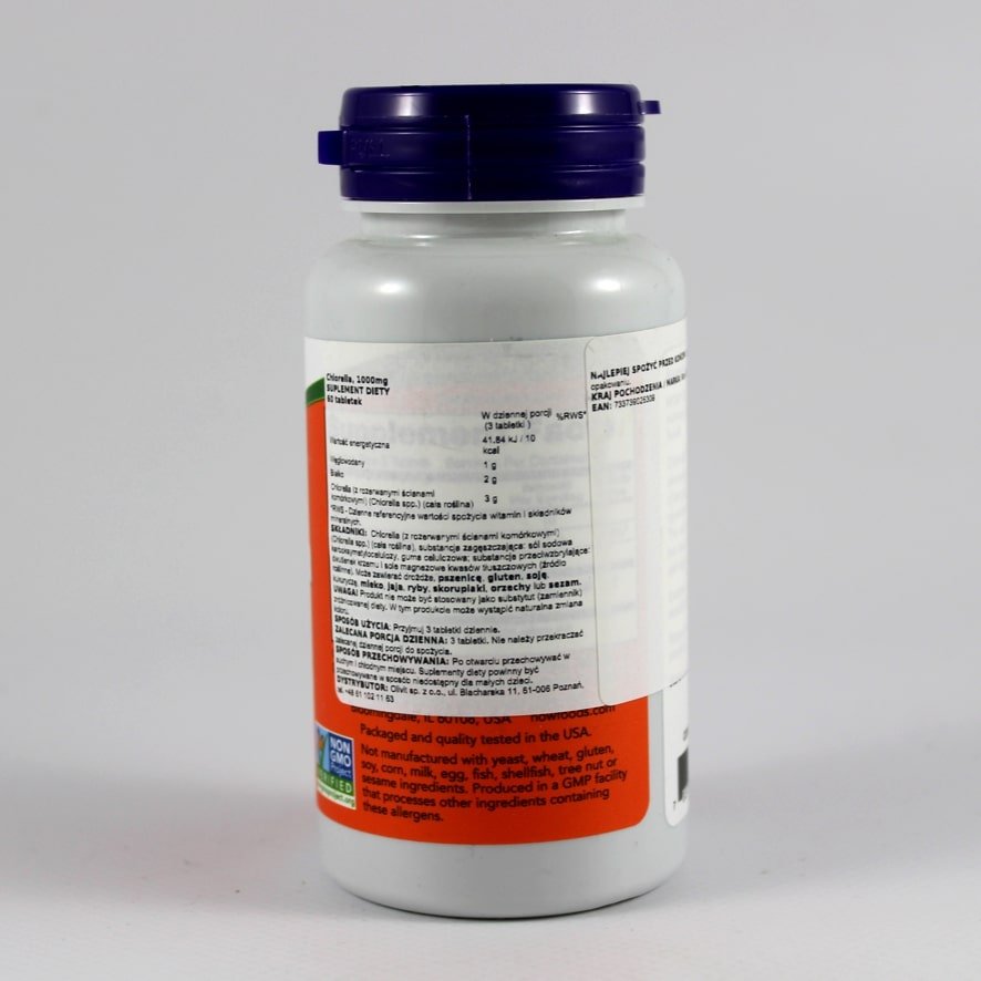 Składniki: Chlorella (mikroalgi z rozerwaną ścianą komórkową), substancje przeciwzbrylające (celuloza, dwutlenek krzemu, sole magnezowe kwasów tłuszczowych roślinne).