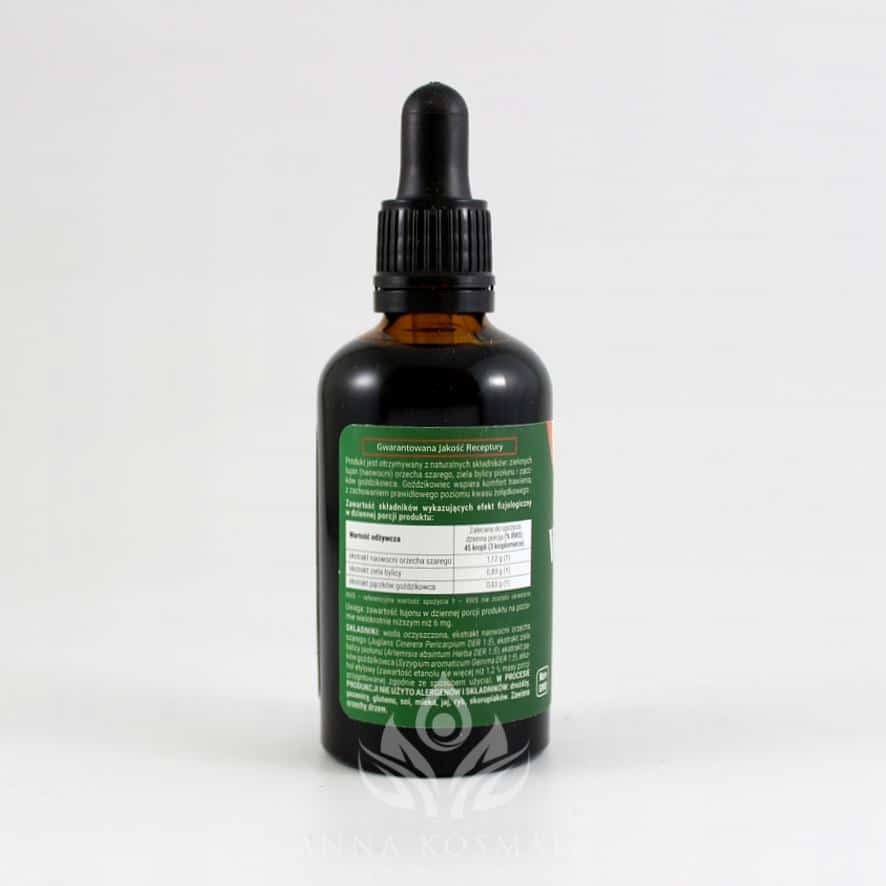Składniki: Woda oczyszczona, ekstrakt naowocni orzecha szarego (Juglans cinerera Pericarpium DER 1:5), ekstrakt ziela bylicy piołunu (Artemisia absintum Herba DER 1:5); ekstrakt pąków goździkowca (Syzygium aromaticum Gemma DER 1:5), alkohol etylowy (zawartość etanolu nie więcej niż 1,2 % masy).