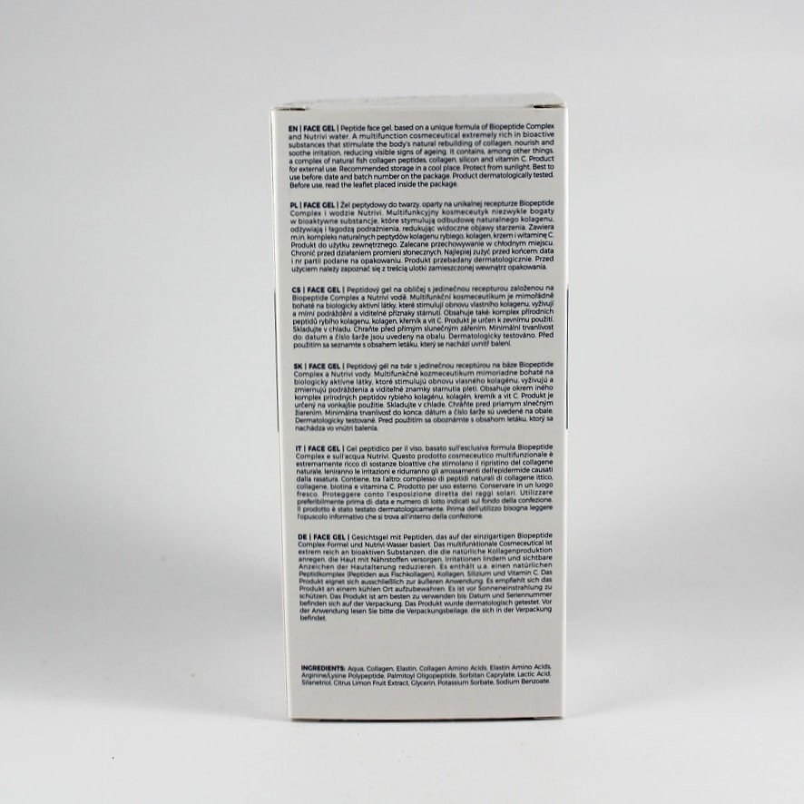 Skład: Aqua, Collagen, Elastin, Arginine/Lysine Polypeptide, Palmitoyl Oligopeptide, Biotin, Urea, Lactic Acid, Citrus Limon Fruit Extract.