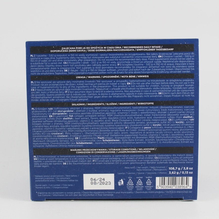 Składniki: Kolagen rybi liofilizowany, ekstrakt z ananasa z bromelainą, MSM (metylosulfonylometan), kadzidłowiec indyjski (Boswellia serrata), siarczan glukozaminy KCl (ze skorupiaków), ekstrakt z buraka, aromaty, regulator kwasowości (kwas cytrynowy), kwas hialuronowy, siarczan chondroityny (ze skorupiaków), kosmatka japońska (Eriobotrya japonica).