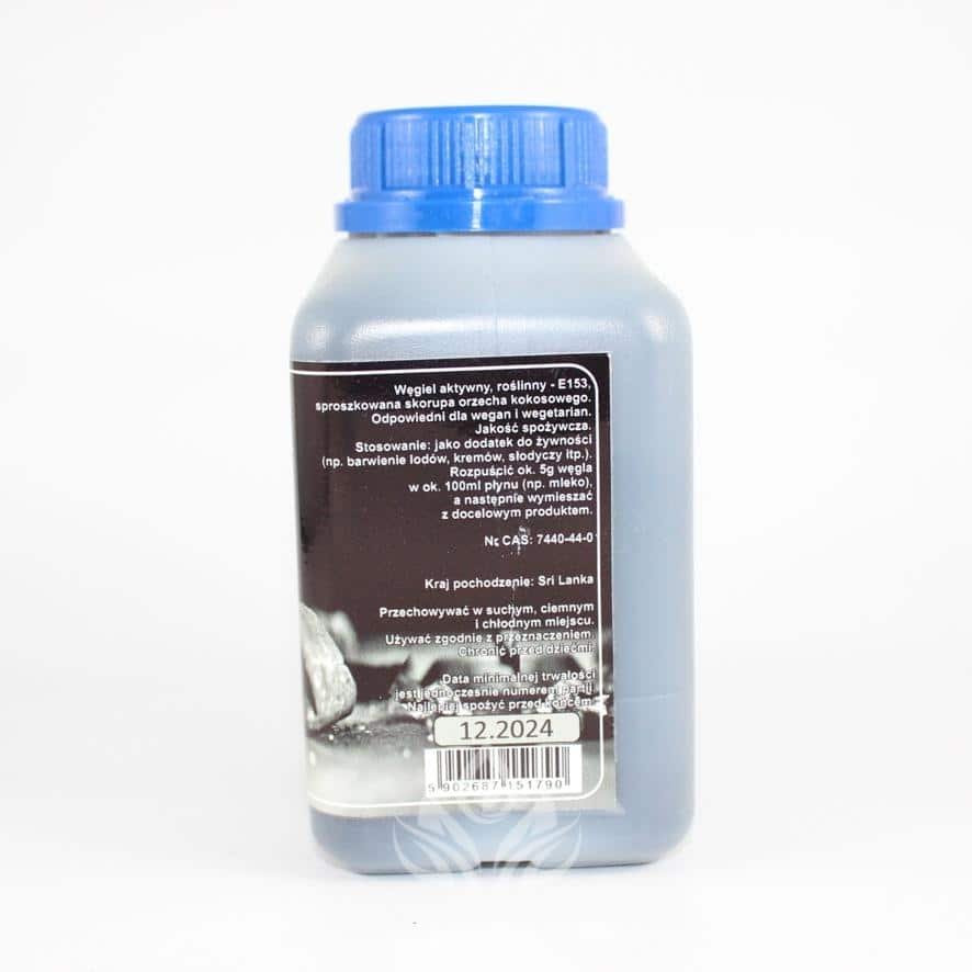 Sposób użycia: rozpuścić ok. 5g węgla w ok. 100ml płynu (np. mleko), a następnie wymieszać z docelowym produktem.