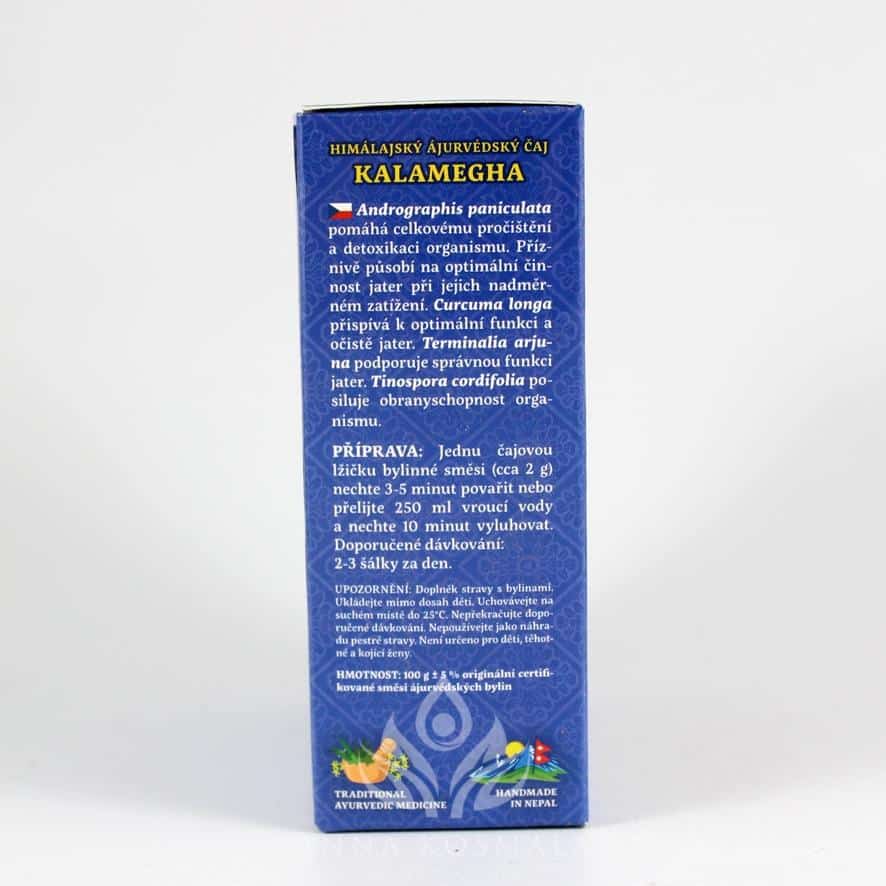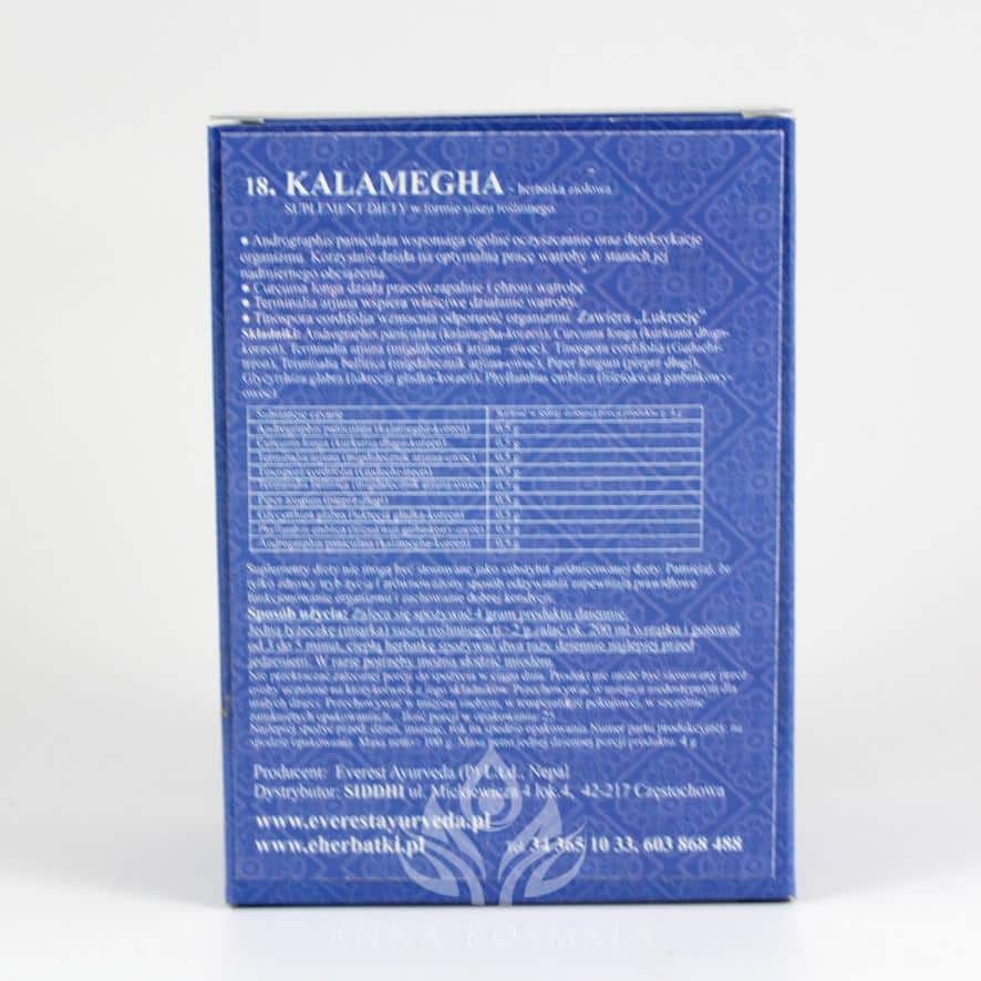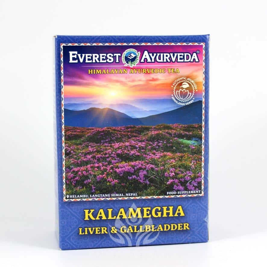 Ajurwedyjska mieszanka ziołowa Kalamegha w formie herbatki do zaparzania, która może mieć wpływ na poprawę pracy wątroby i woreczka żółciowego.