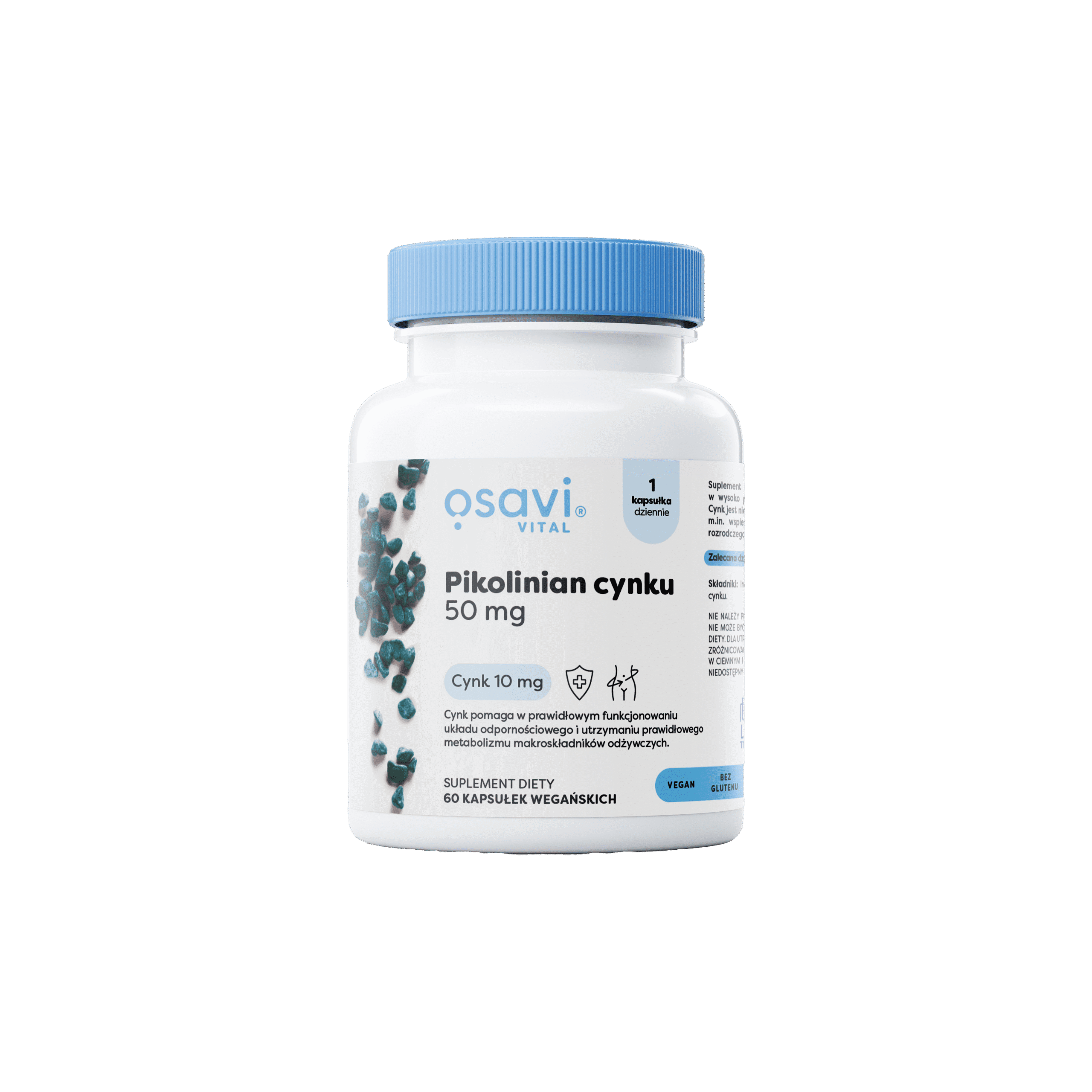 Pikolinian cynku 50 mg OSAVI to suplement diety w formie kapsułek wegańskich, zawierający cynk w organicznej, wysoko przyswajalnej postaci. Każda kapsułka dostarcza 50 mg pikolinianu cynku, w tym 10 mg cynku, co odpowiada 100% referencyjnej wartości spożycia dla dorosłych. Produkt nie zawiera glutenu, cukru, laktozy, soi ani GMO i jest odpowiedni dla wegetarian i wegan. Czysta etykieta – brak zbędnych dodatków. Składniki: inulina, hydroksypropylometyloceluloza (otoczka kapsułki), pikolinian cynku. Zalecane spożycie: 1 kapsułka dziennie, najlepiej z posiłkiem lub po nim. Produkt dostępny w opakowaniach 60, 120 lub 180 kapsułek. Opakowanie wykonane z BioPET, częściowo pochodzącego z trzciny cukrowej. Przechowywać w suchym miejscu, w temperaturze pokojowej, poza zasięgiem dzieci. Nie przekraczać zalecanej porcji do spożycia. Suplement diety nie zastępuje zróżnicowanej diety.