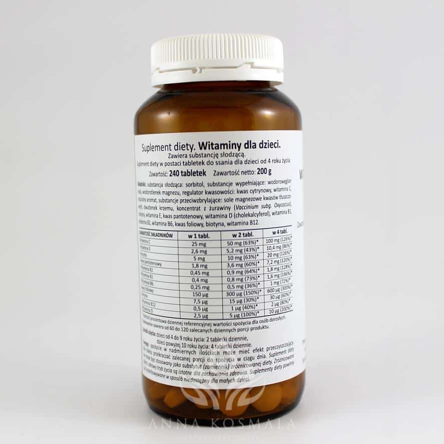 Głównym składnikiem suplementu diety Witaminy dla dzieci 240 tabletek do ssania jest zestaw witamin dedykowanych dzieciom Tabletki z witaminami dla dzieci zawierają specjalnie zbilansowaną kombinację niezbędnych składników odżywczych.